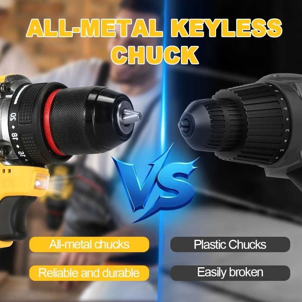 • 【25 Torque Adjustment 】: 25-torque position clutch that provides more precise torque adjustment as needed. Large 3/8″ (10mm) keyless chuck gives you excellent bit retention, This Cordless Drill Kit perfect for DIY making or professional use at family garden or construction site.